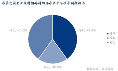 根据调研,春节之前企业优特钢棒材的库存水平与往年同期相比近40%同比持平,40%无缝钢管厂库存同比下降,仅少数库存有增加。预计春节后库存累计情况与往年相比,四成为持平,四成为减少,两成为增加。主要原因是目前来看,库存的减少,导致资源的紧缺,贸易商会向厂家拿货,无缝钢管厂降库会加快。