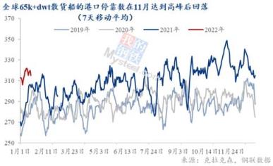 近三个月来,因为所有型船需求疲软,截止2022年1月24日,波罗的海干散货运价指数连续第十二个交易日下滑至1391点,为去年2月以来最低水准。其中海岬型船运价指数下跌140点至891点,为20年6月中旬以来新低。巴西图巴朗—中国青岛的铁矿石运价跌至17.28美金/吨,同比下降12%;西澳至青岛的铁矿石运价也仅为6.79美金/吨。
