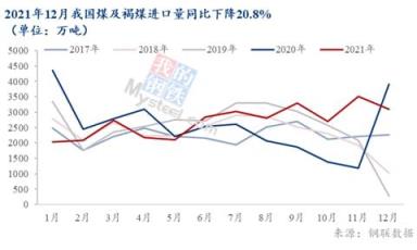 煤炭在供应大幅增产下,国内需求同比下降。与2020年12月同期相比,去年12月下游需求明显高位回落,电力生产同比下降。12月,发电7234亿千瓦时,同比下降2.1%,11月为同比增长0.2%,降幅明显扩大。其中火力发电12月同比下降近5%。