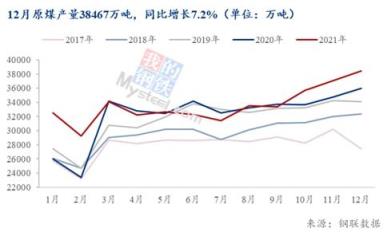 2021年我国原煤产量整体呈现前低后高走势,尤其10月份增产保供、引导煤价回归合理区间以来,我国原煤产量连续三个月屡创年内新高。2021年第四季度原煤合计生产11.1亿吨,约占全年产量27.3%,其中12月生产原煤3.8亿吨,约占全年产量9.5%,保供增产效果显著。