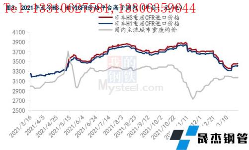 放开废钢进口后的首年,进口量却不及预期,2021年进口总量仅为55.5万吨,远低于2019年之前平均每年200万吨以上的水平。原因主要有两方面:一是政策导向,2021年能够入境的再生钢铁料所对应的海关商品编码只有5类,其对应的海关编码分别是:7204100010(铸铁碎料)、7204210010(不锈碎料)、7204290010(其他合金碎料)、7204410010(粉状废料)、7204490030(其他废碎料),上述类别均属于纯净的优质废钢,政策决定了废钢的进口门槛变高;二是以日本优质重废HS、H1为例,两种料形的CFR价格平台在2021年中均高于国内主流城市的重废均价(图3),由于这两种料形均属于日本国内的优质废钢,其资源量本身就有限,出口量不大,外加东亚地区的其他国家也会从日本进口该料形,所以这种优质废钢在2021年中基本处于供小于求的状态,价格因此高企。但以日本中废H2为例,由于该料形要差于HS、H1,所以H2料形的CFR价格平台接近国内主流城市的中废均价(图4)。