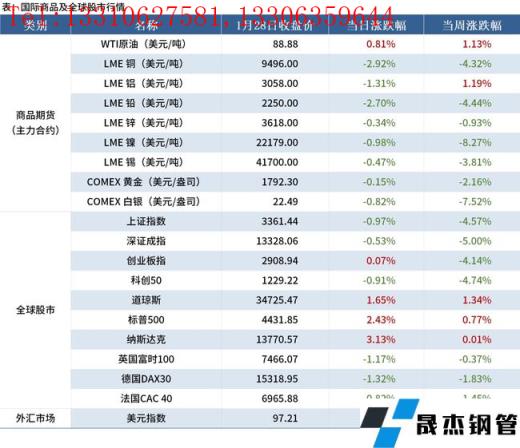金融市场:本周主要商品期货品种多下跌,其中黄金大跌8.27%;全球股市中,中欧股市基本下跌,美国股市跌后反弹;美元指数97.21,上涨1.65%。