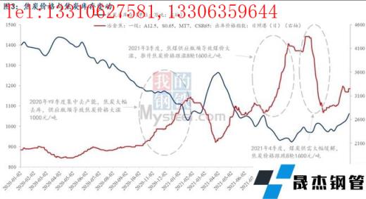 2)而2021年虽没有再出现2020年4季度集中大幅去产能的情况。但仍出现了2021年三季度焦炭价格大涨1600元/吨的情形,两个半月涨幅48%,涨幅明显高于2020年四季度。这主要是由于焦煤供应受限导致的煤价大涨推升焦炭成本大幅上涨,以吕梁低硫主焦煤来看,其价格从6月底至9月底涨了一倍(2050-4100元/吨),焦炭供应矛盾从产能约束转移至原料供应受限。同样的,2021年四季度后,国家出台煤炭保供政策,原料供应大幅缓解,同时需求端铁水产量大减,最终传导至焦煤价格大跌,焦炭价格应声回落1600元/吨。