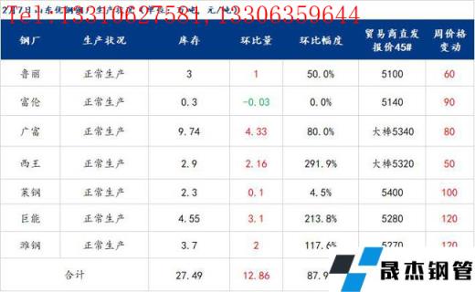 2月7日山东优特无缝厚壁钢管厂家棒材总库存27.49万吨,较节前增加12.86万吨,增幅88%,较去年春节后库存减少3万吨。