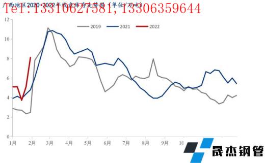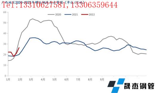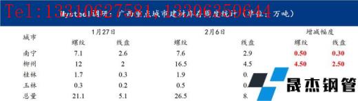 本周广西建筑厚壁无缝钢管价格小幅上涨,较节前上涨80元/吨。春节期间由于需求停滞,贸易商提货较少,多数滞留在厂内,因而社库库存整体增加幅度较往年有所降低。商家整体心态尚可,对后市观望情绪浓厚。截至昨日(正月初六)据我网跟踪调研统计,广西市场库存建筑厚壁无缝钢管34.6万吨,较节前相比增加8.4万吨,较去年节后同期相比减少5.9万吨。从区域数据来看,南宁市场主要库存资源为桂万钢,其商户资源多数在厂内,只要节前零星商户的资源到本仓库,以及有云南材等资源,因而整体增加了0.8万吨;而柳州市场由于柳钢资源多数都会发往物流园,因而资源相对增加幅度较高,较春节前增加7万吨。从整体库存来看,厂家和社会库存压力尚在,但是随着后期需求的释放,或将有所缓解,短期本地市场价格或将继续面临小幅上涨。