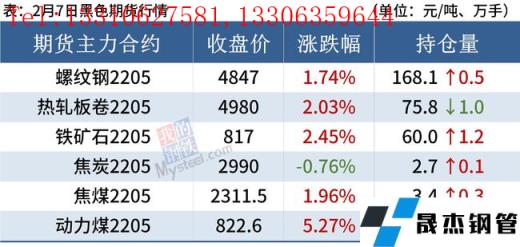 热轧板卷:2月7日,全国24个主要城市4.75mm热轧板卷均价5011元/吨,较节前(1月30日)上涨97元/吨。目前整体市场上涨幅度较大,在冬奥会限产背景下,需求将逐渐趋于好转,现货市场情绪较为乐观,各地厚壁无缝钢管现货价格全面上涨。春节期间,主流无缝厚壁钢管厂家均上调2月出厂价,截止2月6日,全国五大主要厚壁无缝钢管品种总库存共增加477.47万吨至2030.02万吨,较去年同期下降27%,环比增幅30.77%。故预计8日热轧板卷价格或将稳中上行。