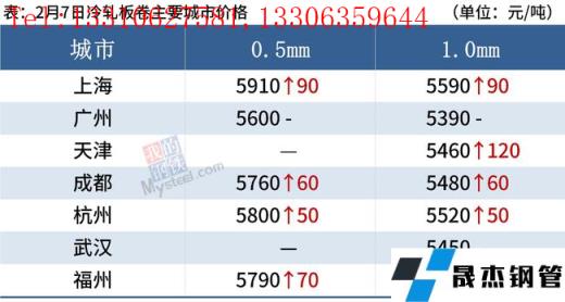冷轧板卷:2月7日,全国24个主要城市1.0mm冷卷均价5525元/吨,较节前(1月30日)上涨57元/吨。据市场反馈,今日大部分钢贸企业未全面复工,大部分陆续要8-10号陆续进入复工,当前市场暂无明显成交,受原材料价格提涨,冷轧贸易商先提涨价格,市场呈有价无市状态。基本面看,截止6号调研数据显示,冷轧无缝厚壁钢管厂家产能利用率79.10%,周环比减少2.31%;厂库周环比增加7.16万吨,社库周环比增加8.45,月环比增加12.30万吨,年同比增加14.03万吨,基本面压力尚可。预计8日全国冷轧板卷现货价格多震荡上调为主。