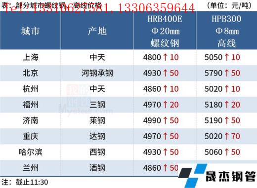 ◎上海:8日早盘建材市场价格上涨10。现螺纹4730-4770,西城抗震4780,其他4650-4710,兴鑫抗震4720,联鑫黄海抗震4730,盘螺4850-5050,高线亚新4750。(单位:元/吨)