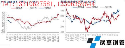 1月份广州、杭州市场市场价格涨幅缓慢,北京市场价格涨幅居前,因此广州-北京、杭州-北京市场的区域价差均有所收窄。目前广州-北京价差在300元/吨左右,此价差略低于2020年、2021年同期水平,且结合无缝厚壁钢管厂家的政策以及运费来看此价差也不足以吸引北方区域资源南下广州。目前杭州-北京价差不足100元/吨,因北京价格相对高位,加之东北区域节后需求启动较晚,因此东北区域部分无缝厚壁钢管厂家倾向于把资源投放至北京区域,其中西林、新抚钢甚至于海鑫都有此安排。