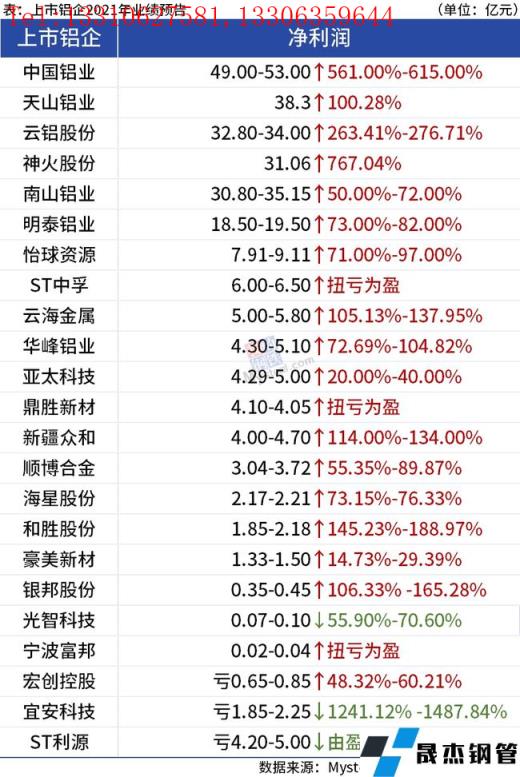 据不完全统计,截至2月9日,已有23家上市铝企披露2021年业绩预告,20家净利预增,占比约86%。其中神火股份净利润增幅最大,报告期内盈利31.06亿元,同比增长767.04%。