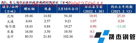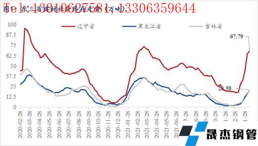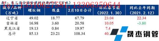 各主流城市分仓库来看,春节后两周以来沈阳市场几大主流仓库增库较多;大连市场到货节奏一般、正常累库;吉林省内长春两大主流仓库现货库存也在增加。从无缝厚壁钢管厂家产量及库存来看,本周区域内样本无缝厚壁钢管厂家总产量47.7万吨,较上周降1.20万吨;厂库总量14.19万吨,与上周变化不大,仅增了0.08万吨,社库则大幅度增了40.52万吨,目前区域内主导无缝厚壁钢管厂家生产节奏与节前相比变化不大,不过下游终端仍未启动,市场现货消耗能力有限,社库继续大幅度累积,多数商户表示正月十五后需求或有零星释放,但真正有效的启动时间要等到2月底3月初了,因此在无需求的情形下,预估下周东北区域社库或仍将继续增加。