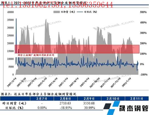 本省无缝厚壁钢管厂家到货情况基本处于往年同期低位水平,以本省主导钢企为例,截止11日统计本省主导钢企废钢到货昨卸3710.52吨,较前一日增14.75%;今总计到船10条,海船3条,大小车20车。回顾开市以来的到货情况,本省主导钢企日均到货远低于日耗水平,完全处于耗库状态,且耗库速度相对较快。因此,为满足无缝厚壁钢管厂家日耗所需,主导钢企废钢采购价格拉涨或为大势所趋。