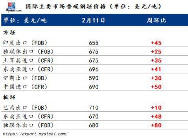 本周独联体价格持续上涨。目前方坯出口价格约为670-680美元/吨FOB,较节前上涨约30美元/吨。
