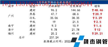 截止2月10日,华南地区主要城市厚壁无缝钢管库存总量为355.2万吨,较上月同期增加117.96万吨,增幅为49.72%,累库速度加快。数据显示华南地区各市场、各厚壁无缝钢管品种库存均有所增加。其中,广州地区厚壁无缝钢管库存273.11万吨,较上月同期相比增加75.15万吨;其中建材库存144.66万吨,月环比增加48.46万吨,增幅明显;板材库存总量128.45万吨,月环比增加26.72万吨。回顾1月份,华南地区厚壁无缝钢管库存增幅明显,主要受春节假期影响,市场在1月中下旬开始交投节奏逐渐放缓,节日期间成交几近于无,但部分码头港口仍留有值班人员接货,加上长流程无缝厚壁钢管厂家生产节奏正常,因此在供应端基本不变、需求端停滞情况下,库存明显累积;值得注意的是,因能耗双控等原因,年前部分无缝厚壁钢管厂家停产、减产比例较大,导致当前华南地区库存水平同比去年较低。