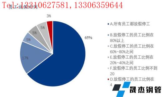 本次调研样本企业中所有员工均放假的占比65%;放假停工的员工比例80%以上的占比17%;放假停工的员工比例60-80%的占比5%;放假停工的员工比例60%以下的仅有13%。