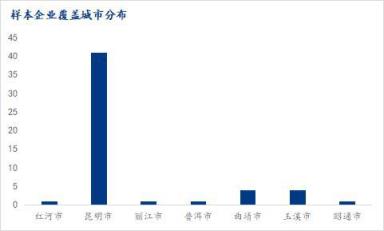 本次调研样本中云南企业53家,昆明企业41家,占比77.36%,玉溪市和曲靖市企业各4家,分别占比7.55%;红河、丽江、普洱、昭通企业各1家,占比为7.55%。