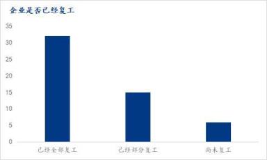 2、截止调研日,已经有超过88.68%的企业完全复工或部分复工,未复工的企业也将在未来1-2周之内复工;复工企业当中基本都已正常生产,只有5.7%企业延迟1-2周恢复到正常生产状态;