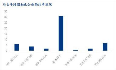 3、同比去年,22.64%的企业订单出现了不同程度增长,58.49%企业订单基本与去年持平,但我们也看到了18.88%企业订单出现了下滑;