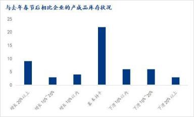 调研样本企业中,相比去年春节后产成品库存方面,增长20%以上的企业占比16.98%,增长10%-20%的企业占比5.66%,增长10%以内的占比为7.55%;与去年持平的企业占比41.5%;下滑10%以内的企业占比11.32%,下滑10%-20%的企业占比11.32%,下滑20%以上的企业占比5.66%。