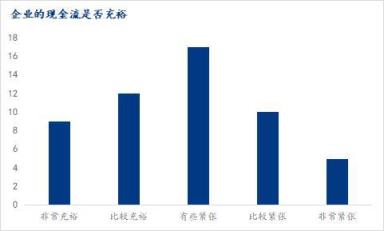 调研样本企业中,现金流非常充裕(维持半年以上)的企业占比为16.98%,现金流比较充裕(维持3-6个月)的企业占比有22.64%,现金流有些紧张(维持1-3个月)的企业占比有32.08%,现金流比较紧张(维持1个月)的企业占比有18.87%,现金非常紧张(基本没有现金流)的企业占比为9.43%。