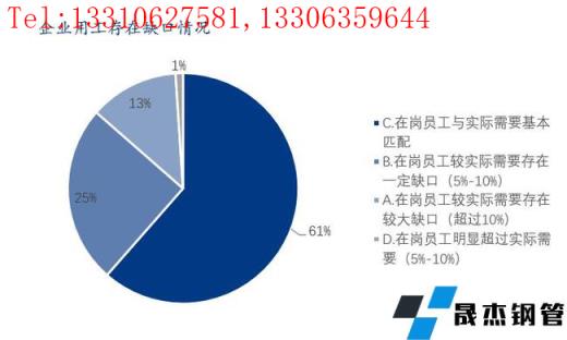 本次调研样本企业中在岗员工数量较实际需要存在缺口的企业占比38%;在岗员工数量较实际需要基本匹配的占61%;在岗员工数量超过实际需要的占比1%。