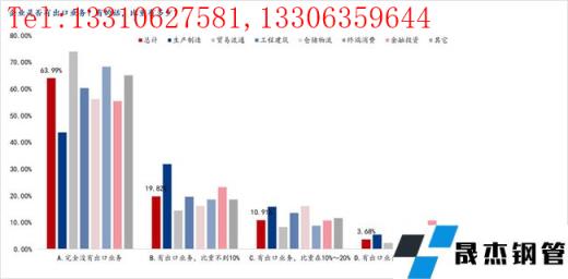 本地调研,我们还就企业是否有出口业务、出口业务比重有进行了调研。 调研显示,完全没有出口业务的企业占比63.99%,有出口业务,比重不到10%的企业占比19.82%,有出口业务,比重在10%~20%的企业占比10.91%,有出口业务,比重在20%~50%的企业占比3.68%,有出口业务,比重在50%以上的占比只有1.60%。分行业来看,几乎所有行业出口占比都比较低,其中生产企业整体要高于其他行业。