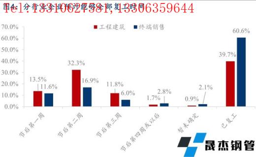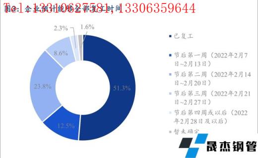 分行业来看,终端销售样本企业中,60.6%的企业目前已经完全复工,节后第二周内能够复工的样本企业占比可以达到89.1%,主要由于今年节前冬储备货情况整体较少,节后开门红的行情走势下,很多企业提前复工,积极入市询价采购,以争取利润最大化。工程建筑样本企业中,39.7%的企业目前已经完成复工,节后第二周内能够复工的样本企业占比可以达到85.6%,整体进度情况也要好于往年同期水平。仅0.9%的工程建筑企业和2.1%的终端销售企业暂未有明确的复工时间,主要是受疫情以及冬奥会的影响。