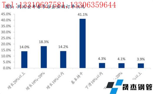 据调研,今年企业订单状况较去年节后同期相比有明显好转,企业订单较去年持平和增加的样本比例高达87.7%,仅12.3%的样本企业订单状况较去年有所下滑,其中订单数下滑20%以上的企业占比3.9%。