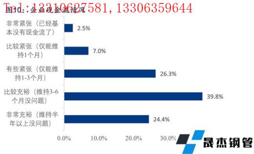 据调研,64.1%的样本企业资金流是比较或者非常充裕的,26.3%的样本企业资金有些紧张,仅能维持1-3个月,而资金压力比较及非常紧张的样本企业占比9.6%。