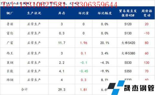 2月14日山东优特无缝厚壁钢管厂家棒材总库存29.3万吨,环比增加1.81万吨,增幅6.58%,较去年春节后第二周库存增加4.1万吨。
