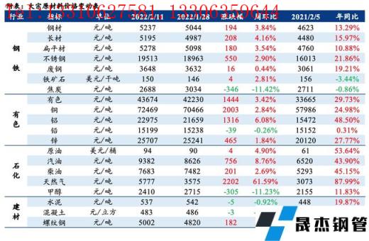 后期来看,钢价涨势或放缓,主要在于:1)市场情绪乐观,库存压力小于往年。受1月超预期的社融和信贷数据刺激,市场情绪偏乐观。而今年春节后的库存压力明显小于往年,市场看涨情绪浓厚。2)下周地产数据公布,或不及预期。在基建的带动下,1月信贷明显改善,社融也创单月历史新高,反映实体经济融资需求改善。但1月居民中长期贷款增速同比下降,全国13家重点房企销额同比大幅下滑37%,叠加1月螺纹消费同比下滑24.5%,表明房地产行业需求依然疲弱。下周地产数据公布,数据多半表现较差,或对市场情绪造成负面影响。此外,当前消费仍然疲弱,价格上涨速度较快,但基本没有成交。3)成本支撑或减弱。华北环保限产加严,且2月是钢企主动去原料库存阶段,原料需求偏弱,叠加发改委对铁矿石和煤炭价格过快上涨监管力度加严,厚壁无缝钢管成本有下跌风险,或拖累钢价。