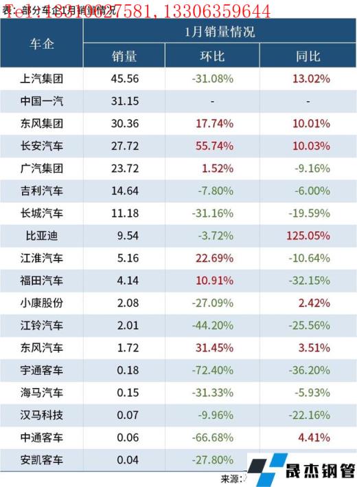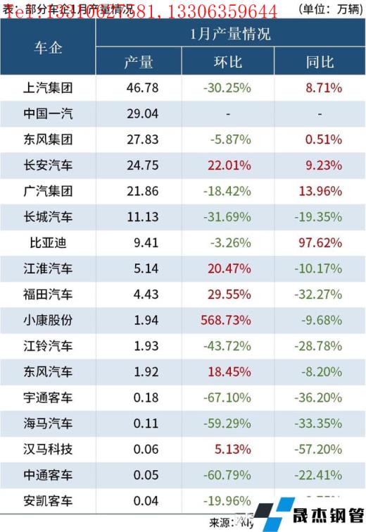由于今年春节早,1月最后一周进入车市的春节休眠期,因此从同比来看1月车企的产销量不如去年。除上汽集团、东风汽车、长安汽车和比亚迪几家大车企外,其余车企的产销量皆有不同幅度的下降。