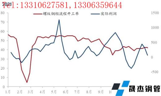 而对于2021年的数据来说无论是相关分析还是回归分析结果表现出与其他年份有不同的结果,这与2021年的特殊情况有关。由于2021年螺纹钢价格的急剧变化,导致电弧炉实际利润具有了极强的波动性,而且由于能耗双控,从8月底电弧炉无缝厚壁钢管厂家被严格限产,导致了电弧炉开工率有近20%左右的持续下降,创造了历史低位,政策以及成材价格变动明显干扰了数据的观测,如下图所示: