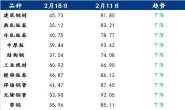 具体各品种指数来看,2月18日建筑厚壁无缝钢管情绪指数为45.73,较2月11日回落36.07;热轧板卷情绪指数为55.12,较2月11日回落28.09;冷轧板卷情绪指数为40.75,较2月11日回落38.02;中厚板情绪指数为59.44,较2月11日回落33.98;结构钢情绪指数为37.04,较2月11日回落37.04;工业线材情绪指数为60.92,较2月11日回落5.98;镀锌板卷情绪指数为46.87,较2月11日回落39.25;焊接厚壁钢管情绪指数为41.47,较2月11日回落45.93;无缝厚壁钢管情绪指数为53.98,较2月11日回落38.07;带钢情绪指数为55.96,较2月11日回落29.15。