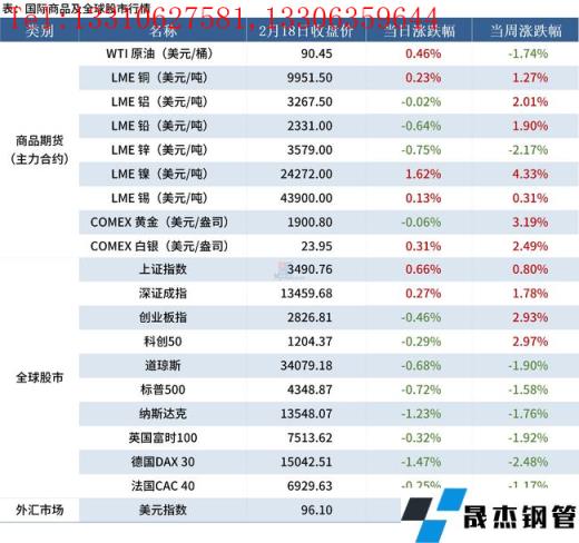 金融市场:本周主要商品期货品种价格除原油和镍下跌外,其余均上涨;全球股市中,中国股市上涨明显,欧美股市基本下跌;美元指数96.1,上涨0.07%。