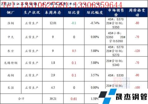 江苏优特无缝厚壁钢管厂家棒材总库存39.21万吨,较上周上升0.61万吨,环比增1.58%,较去年同期下降8.3万吨,同比降17.47%,目前江苏优特无缝厚壁钢管厂家均正常生产。