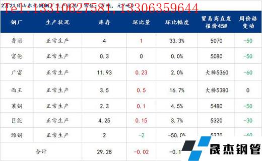 数据:山东优特无缝厚壁钢管厂家库存29.28万吨,环比增下降0.02万吨,减少0.07%,同比减少1.29万吨,减少4.22%。