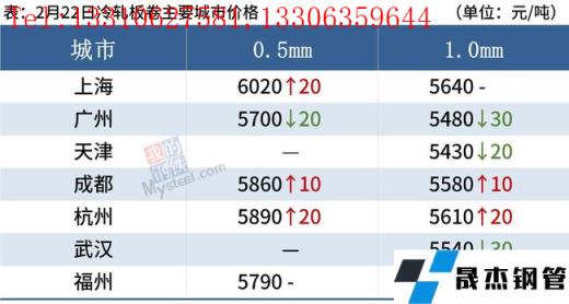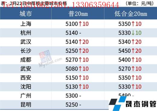 中厚板:2月22日,全国24个主要城市20mm普板均价5198元/吨,较上个交易日上涨8元/吨。今日部分无缝厚壁钢管厂家出厂锁单价进行调整,幅度在-20~40之间,收单情况整体偏差。据对各地商户的简单调研,目前需求较去年同期普遍偏差,成交方面不理想。综合来看,预期23日国内中板价格震荡偏弱运行。