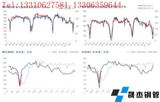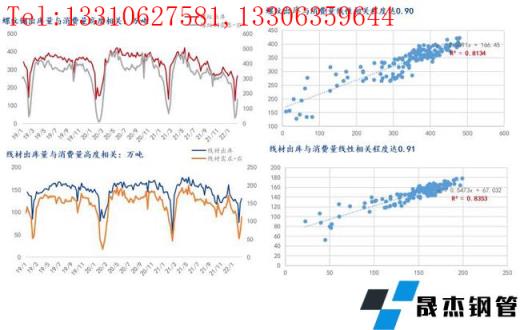 螺纹钢和线材出库量与消费量线性相关程度达均达0.9。依据调研,选取主要品种螺纹钢和线材,测算衍生指标无缝厚壁钢管厂家出库量和周表观消费量,可见出库量在年内周期波动与消费量趋势基本一致,季节性趋势变化均较为突出。不同的是,出库量底部水平明显高于消费量,这是因为消费量受制于市场库存增减变化,进而在绝对值对比上少于出库量。