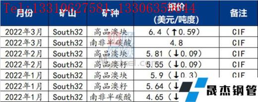 South32对华3月装船报价:高品澳块6.4美元/吨度(涨0.59),南非半碳酸4.8美元/吨度。
