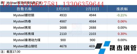 ◎ 2月23日全国15家长、短流程代表无缝厚壁钢管厂家废钢库存总量102.78万吨,较昨日增1.04万吨;库存周转天数11.8天,较昨日持平;日均消耗3913.33吨,较昨日增11.81%;日均到货量4606.67吨,较昨日增14.78%。