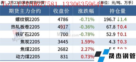 2月23日主要观点:①、全国31个主要城市20mm三级抗震螺纹钢均价4930元/吨,较上个交易日跌9元/吨。预计24日国内建筑厚壁无缝钢管或将维持弱势运行。②、全国24个主要城市4.75mm热轧板卷均价5025元/吨,较上个交易日下跌10元/吨。预计24日热轧板卷价格或窄幅震荡运行。③、全国24个主要城市1.0mm冷卷均价5575元/吨,较上个交易日下跌5元/吨。预计24日全国冷轧板卷价格或将震荡偏弱运行。④、全国24个主要城市20mm普板均价5187元/吨,较上一交易日下跌11元/吨。预计24日中厚板价格或将仍以盘整运行为主。⑤、全国45个主要市场废钢平均价3195元/吨,较上一交易日价格降1元/吨。预计短期废钢市场价格窄幅震荡运行。⑥、山东进口铁矿石现货市场报价先涨后跌,整体交投情绪较为冷清,贸易商多一单一议,无缝厚壁钢管厂家按需采购。⑦、焦炭市场暂稳偏强运行。焦炭第一轮提涨200元/吨,主流无缝厚壁钢管厂家暂无回应。预计第一轮提涨本周有望落地,预计短期内焦炭市场暂稳偏强运行。