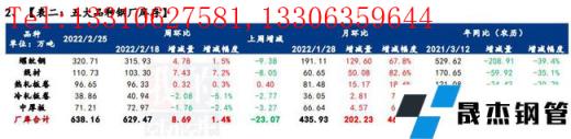 据统计,建材方面,分品种来看,螺线供库双增;分域来看,除东北和华北少量减产,其余区域均有增量;从省份来看,河南、四川、广东、广西、江苏和浙江增量明显,主因在于设备复产;从工艺角度来看,本周增产贡献率主要在短流程生产企业。热卷方面,本周热轧产量大幅回升,主要增幅地区是华北地区,主要是冬奥会限产结束,部分无缝厚壁钢管厂家轧机及高炉复产,导致产量增加,主要降幅地区是华中地区,主要是新增无缝厚壁钢管厂家检修,导致供给有所下降。