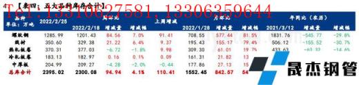 库存方面,五大品种厚壁无缝钢管总库存春节后连续累增四周,环比上周增加94.94万吨,增幅4.1%。分品种看,建材库存增加105.78万吨,增幅为6.9%;板材库存减少10.84万吨,降幅1.4%;分指标看,无缝厚壁钢管厂家库存环比增加8.69万吨,增幅1.4%;社会库存环比增加86.25万吨,增幅5.2%。