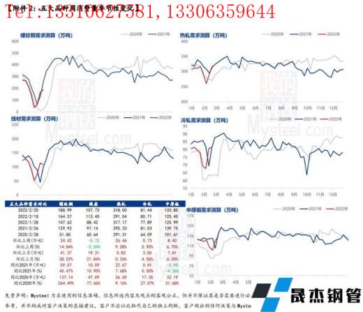 本周五大品种供应均有明显回升,分品种来看,建材增量集中于短流程生产企业,原因在于上周元宵节过后短流程复产比例提升,增量区域集中于华东、华南和西南;板材增量集中于长流程生产企业,原因在于冬奥会结束,部分板材企业铁水逐步恢复,促使轧材增量。综合来看,原料趋弱运行导致成品材成本下移,扩宽企业利润空间,一定程度上提振了企业复产积极性。预计后期供应仍有一定增量空间,但受限于冬奥会后还有残奥会,因此空间相对有限。