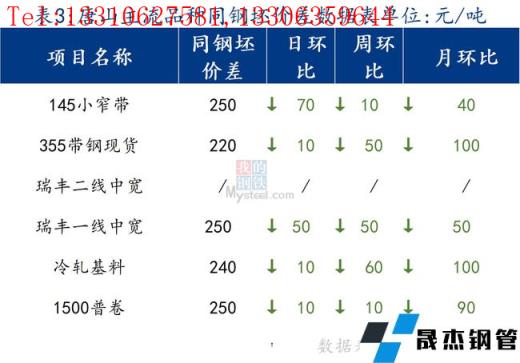 145带钢与钢坯价差明显收窄,调坯轧材在成本偏高的制约下暂缓复产,市场成交不佳,价格继续回落。焊管与355带钢价差稍收窄。热卷与带钢价差回归正区间。