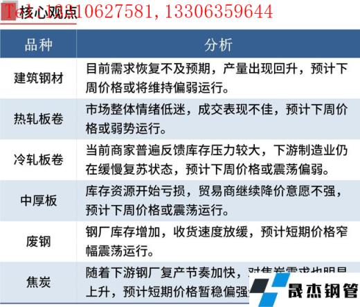 一方面,本周无缝厚壁钢管厂家及下游终端仍处于复工复产进程,但工地复工率低于去年同期,无缝厚壁钢管厂家及社会库存均出现攀升,供需压力偏大,钢价承压下跌。另一方面,随着无缝厚壁钢管厂家持续复产,对原燃料需求增加,铁矿石港库及独立焦企库存均出现下降,后期原燃料价格有支撑。此外,电弧炉无缝厚壁钢管厂家处于盈亏边缘,钢价下跌空间或有限。综合来看,短期钢价或震荡偏弱运行。