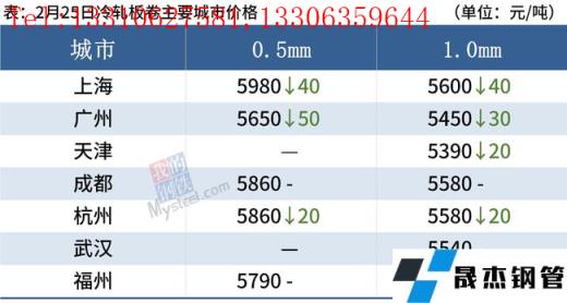 冷轧板卷:2月25日,全国24个主要城市1.0mm冷卷均价5540元/吨,较上个交易日下跌25元/吨。下游终端态度谨慎,按需采购为主今天整体成交表现不理想。就下周市场而言,当前商家普遍反馈库存压力较大,当前主流操作以出货为主。需求方面,下游制造业仍在缓慢复苏状态,但未见明显起色。综合来看,预计下周全国冷轧板卷价格或将震荡偏弱运行。