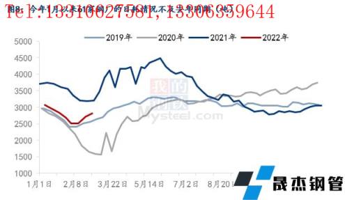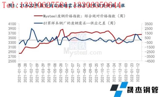 从图1可以看出,21年和22年的冬储期间,废钢价格随着需求的扩大出现了上涨,其实纵观2021年1月至当前的废钢价格走势,可以看出其走势与61家无缝厚壁钢管厂家废钢的供需变化走势有一定的关联性。所以2022年1月以来废钢价格的走高,其中一个原因可以认为是无缝厚壁钢管厂家由于需要冬储而导致的废钢需求增加,拉动了废钢价格的上涨。