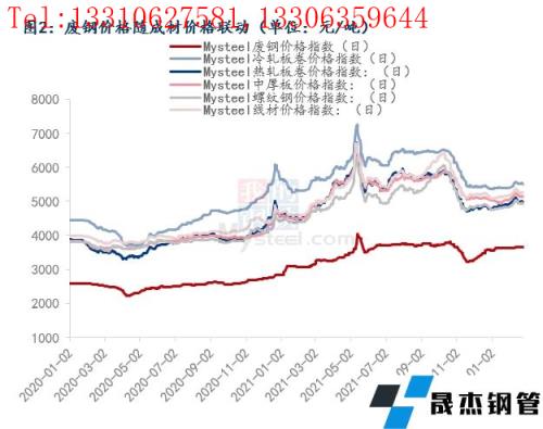 由于废钢的定价权基本掌握在无缝厚壁钢管厂家手中,其价格弹性往往大于成材,如果行情不好导致成材价格出现下跌,那么无缝厚壁钢管厂家就会降低自身的废钢消耗量,下调废钢价格,所以废钢价格可以看成是随着成材价格走势而变化,处于相对被动的位置。由图2可以看出,从近三年的价格走势可以看出,废钢价格与五大材的价格走势关联性很高。今年1月以来截止当前废钢的涨幅为2.49%,五大材的涨幅也均在2%-3%之间,所以今年1月份以来成材价格上涨也支撑了废钢价格的上涨。